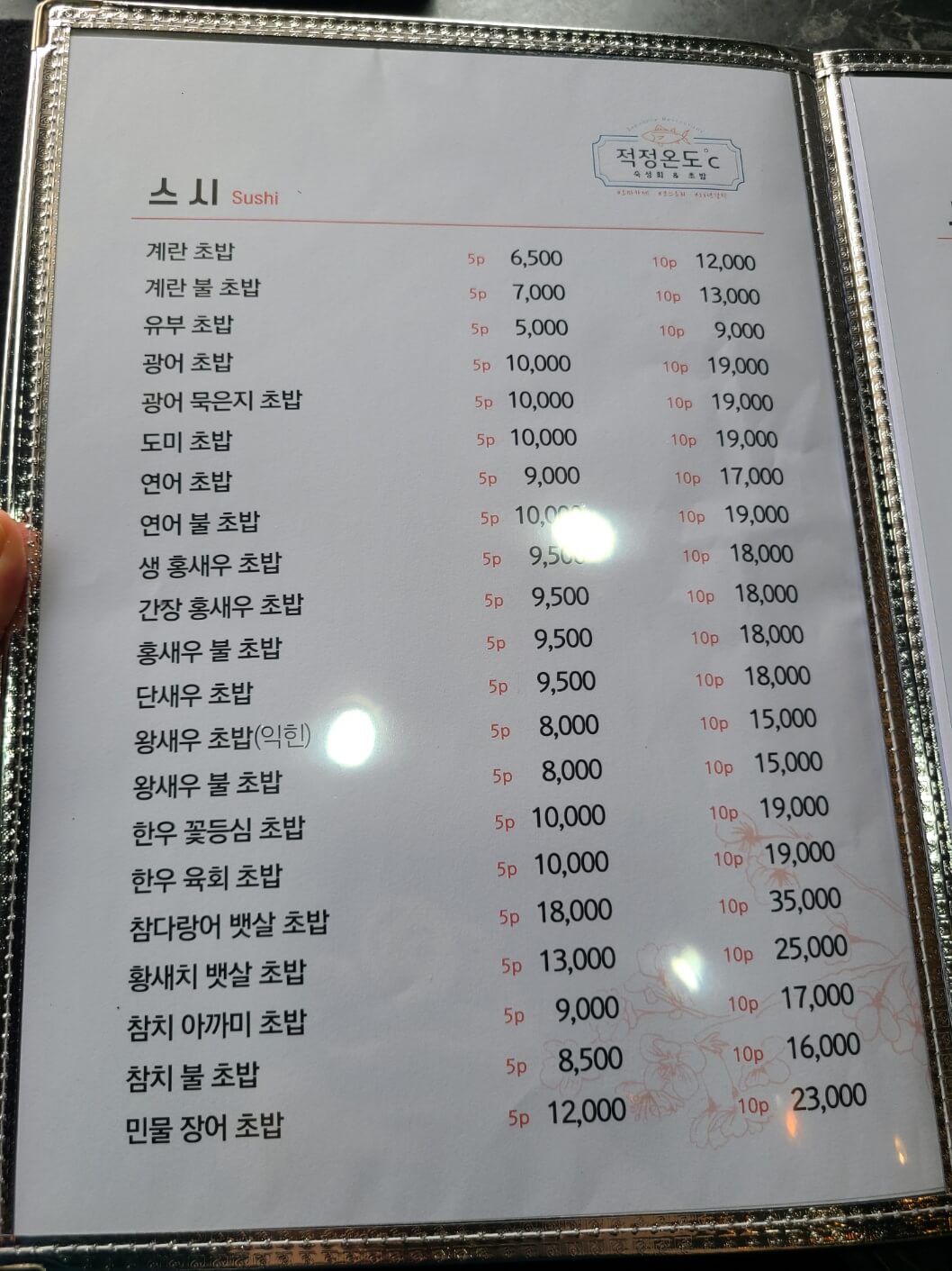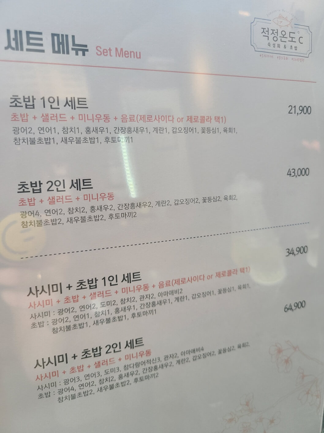 초밥부터 숙성회 사케 음료까지 정말 다양한 메뉴가 있습니다. 아니 이게 다 된다고? 도장 깨기하고 싶을 정도였어요. 하나하나 다 먹어보고 싶었다는 소리입니다. 저희는 모둠초밥 1개, 특 모듬초밥 1개 이렇게 주문했어요.