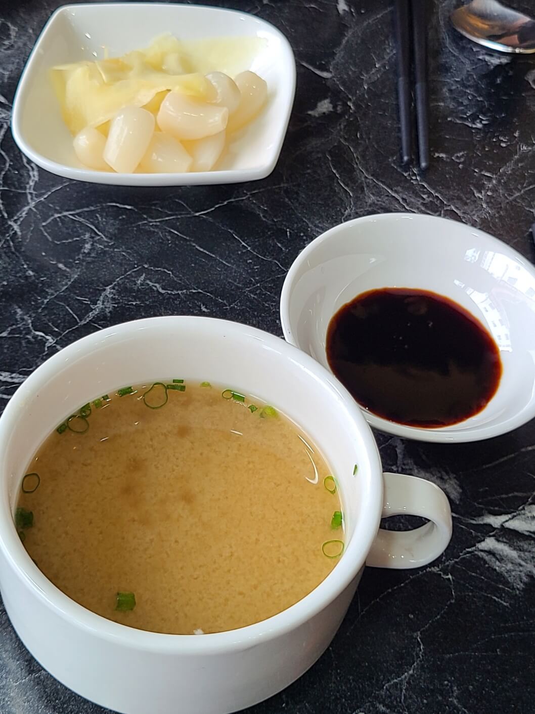 주문을 하고 조금 기다리면 된장국과 간장을 세팅해 주십니다. 된장국이 다 그냥 그저 그런 맛이겠거니 하고 한입 후룩~한 순간 띠용? 하나도 안 느끼하고 고소하고 깊은 맛이 납니다. 신기...