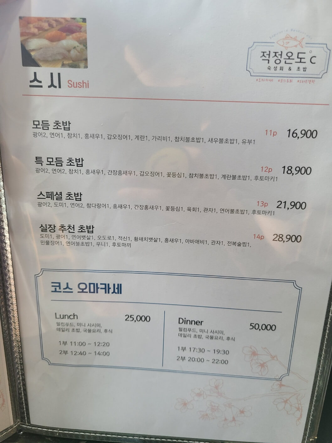 - 메뉴: 모둠초밥 16,900원(11p), 특 모둠초밥 18,900원(12p), 사케동 12,000원 등